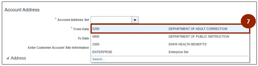 Step 7.    In the Account Address section, select Department of Adult Correction from the Account Address Set dropdown list.