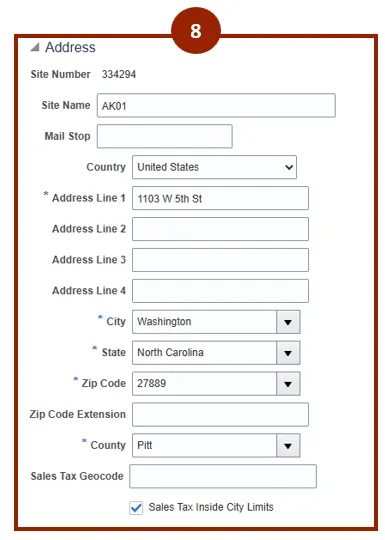 Step 8.    In the Address Section, provide the Site Name and the full address of the customer site for shipping and billing purposes.