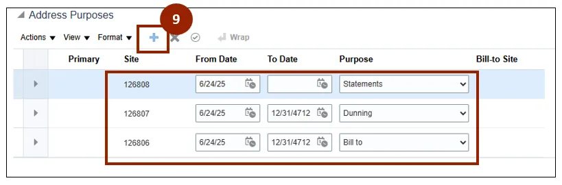Step 9.    Within the Address Purposes section, click the + to add a purpose to the address provided. (i.e., Bill to, Ship to, Dunning, Statements).