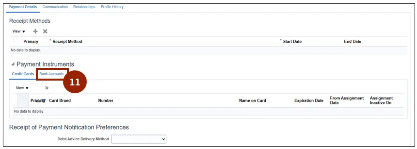 Step 11.    If a customer's banking information needs to be updated, click on Bank Accounts in the Payment Instruments section of the Payment Details tab.