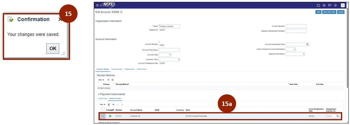 • Step 15a. In the Payment Instruments section, under the Bank Accounts tab users can view the added bank account.