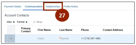 Step 10.    Click on the appropriate tab to update customer information related to each category (i.e. Payment Details, Communication, Relationships, Profile History).