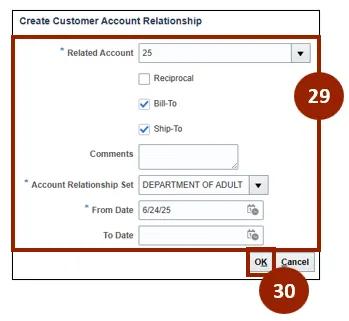 Step 29.    Fill in the mandatory details - Related Account, Account Relationship Set and From Date.