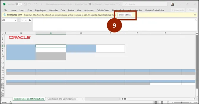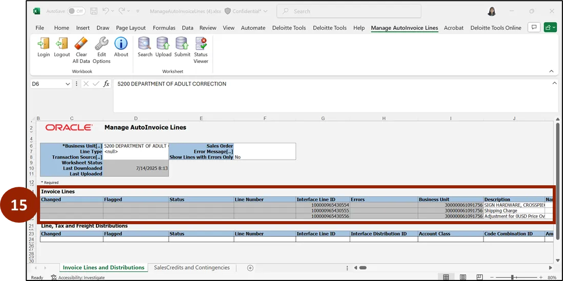 Step 12. The spreadsheet opens, and displays the Invoice Lines, Lines, Tax, and Freight Distributions.
