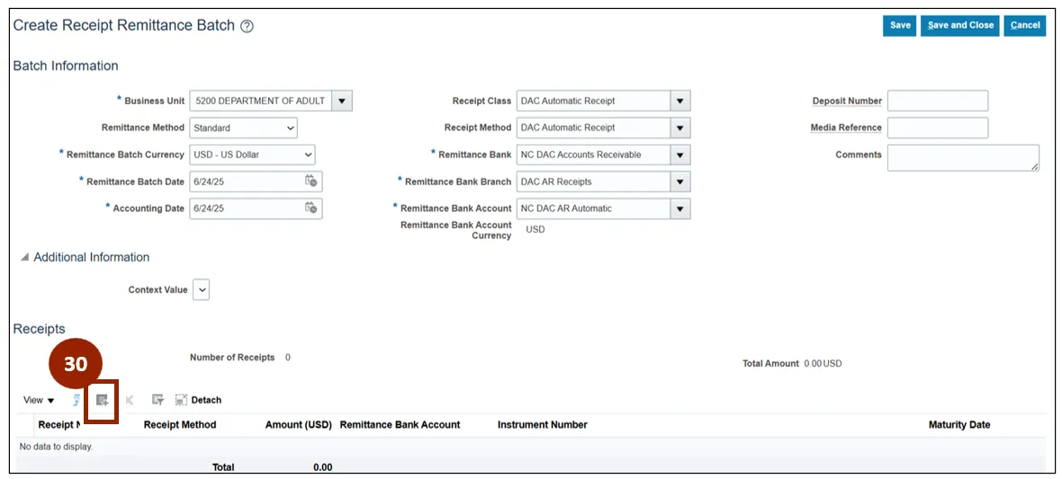 Step 30. Within the Receipts section of the Create Receipt Remittance Batch screen, click the Add Search and Select icon.