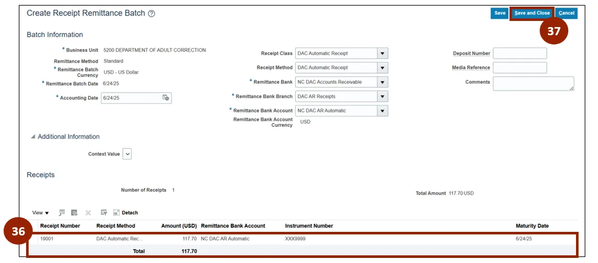 Step 14. Within the Remittance Bank section under the Name drop-down field, select NC DAC Accounts Receivable.
