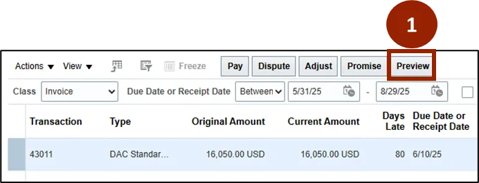 To preview an invoice, follow the steps below. There are 2 steps to complete this process.