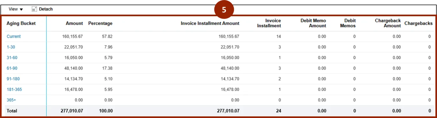Step 5. The options selected will be applied to the Aging Bucket table and you will be able to see information such as Invoice Installment Amount, Invoice Installment number, and Debit Memo Amount for each aging bucket.