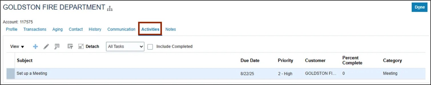 Within the Activities tab of the Customer page, Collectors can manage existing tasks and schedule follow-ups related to the Customer’s account. This helps ensure timely completion of critical activities.