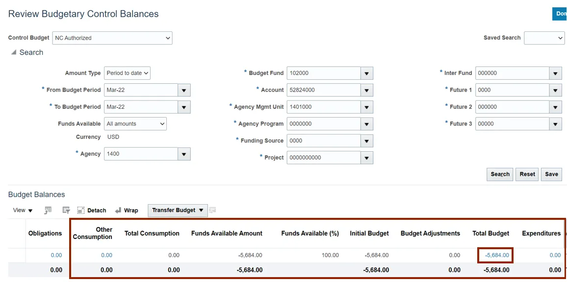 Step 10.    Under the Budget Balances section, the budgetary control balances are displayed.