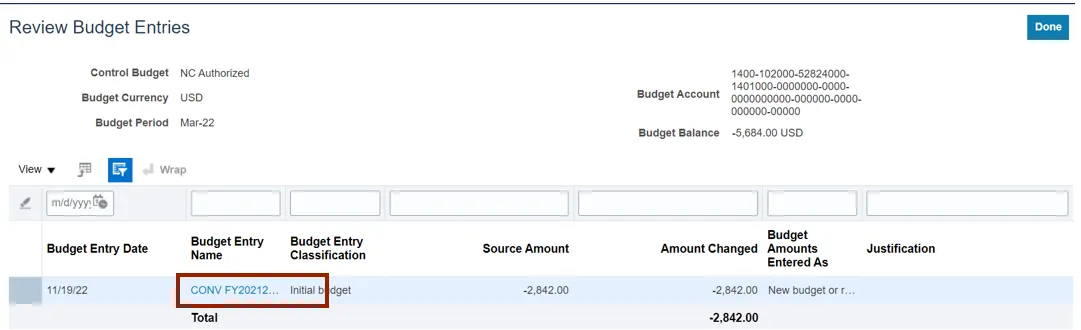Step 6.    Click the Done button. This will redirect you to the Review Budget Entries page.