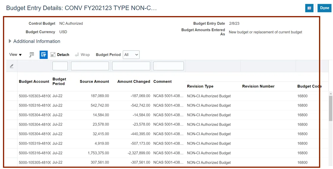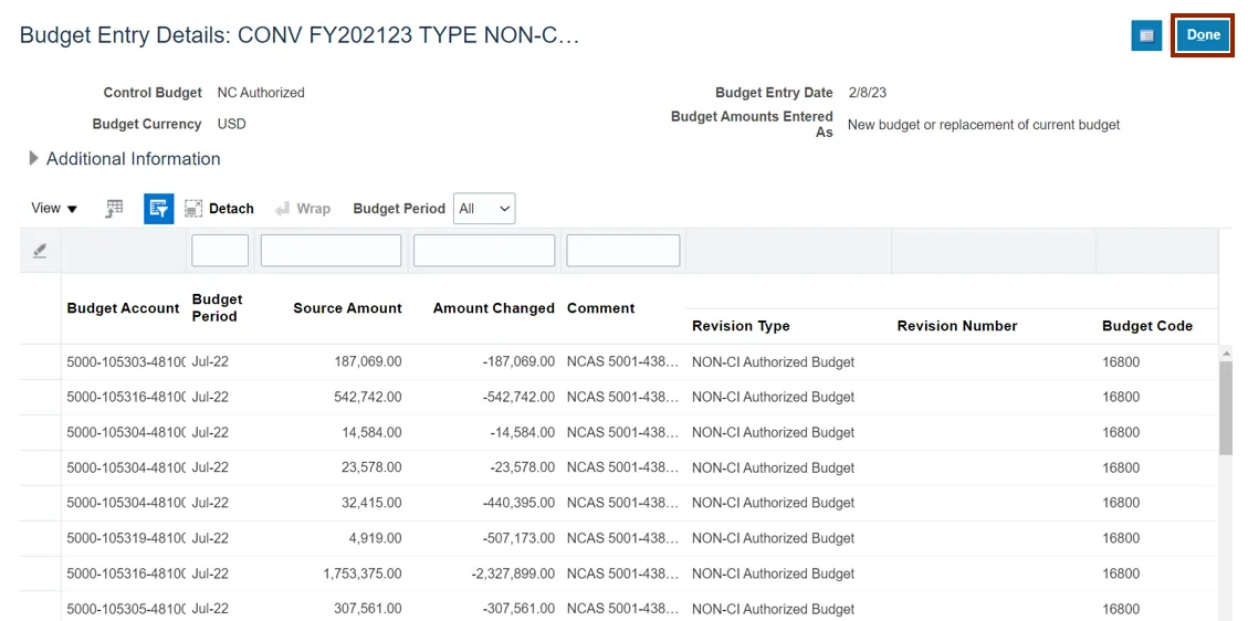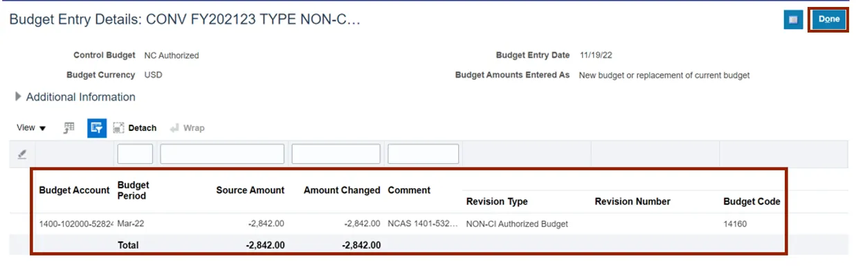 Step 8.    On the Budget Entry Details page, under Additional Information section, review the budget entry details. Click the Done button which will redirect you to Review Budget Entries page.