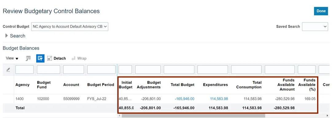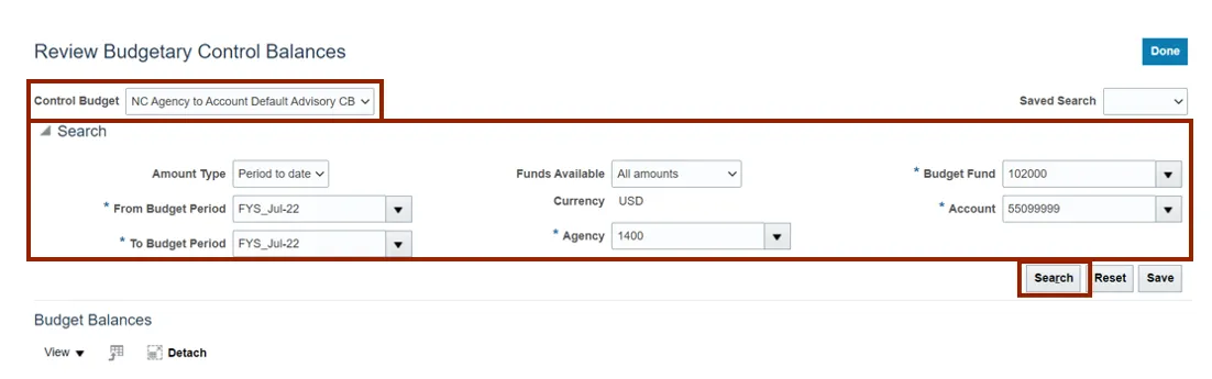 In this example, we choose NC Agency to Account Default Advisory CB for Control Budget, FYS_Jul-22 for From Budget Period and To Budget Period, 1400 for Agency, 102000 for Budget Fund, 55099999 for Account.