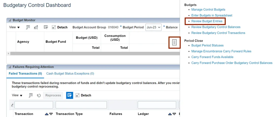 Step 3.    On the Budgetary Control Dashboard, click the Tasks icon and click Review Budget Entries.