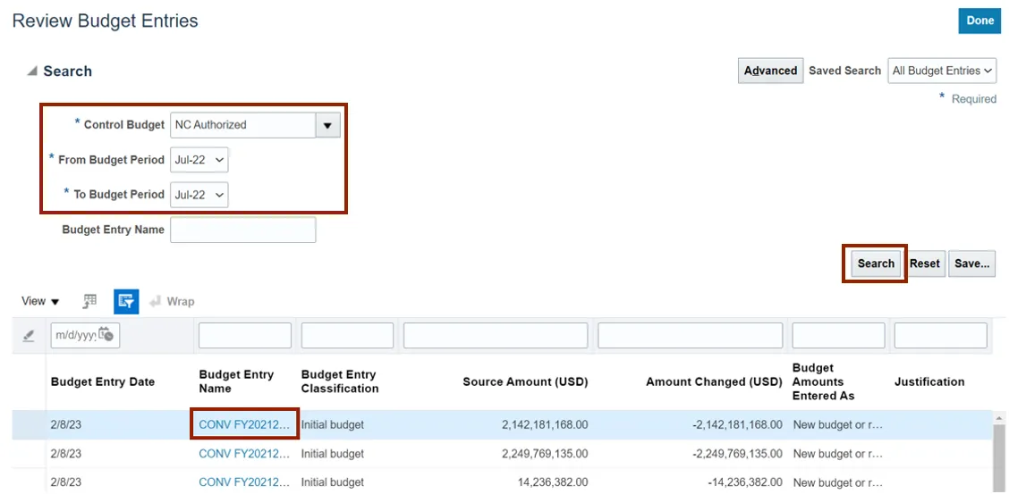Note: To obtain the results for all the budgets, Saved Search should always be set to All Budget Entries.