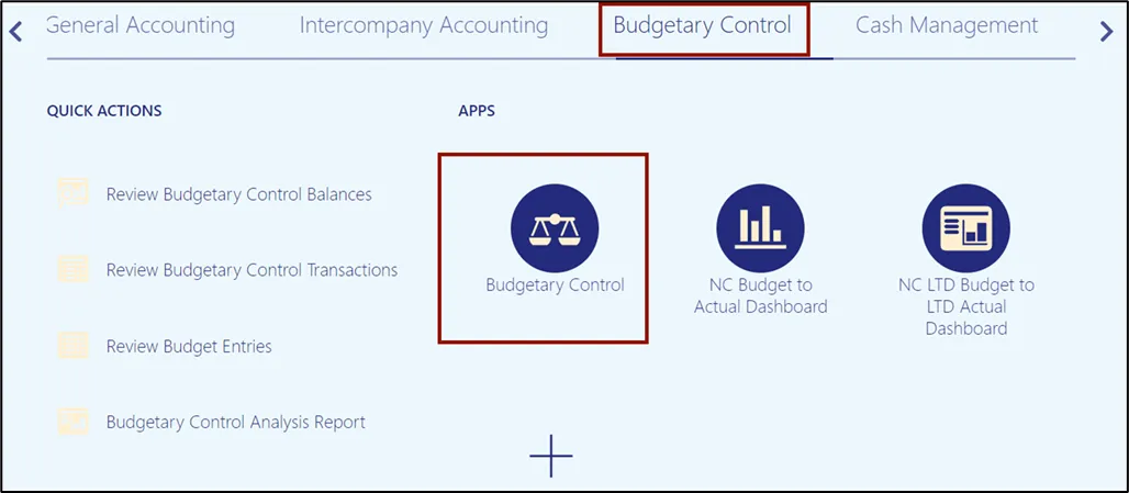 Step 2.    On the Home page, click the Budgetary Control tab and then click the Budgetary Control app.