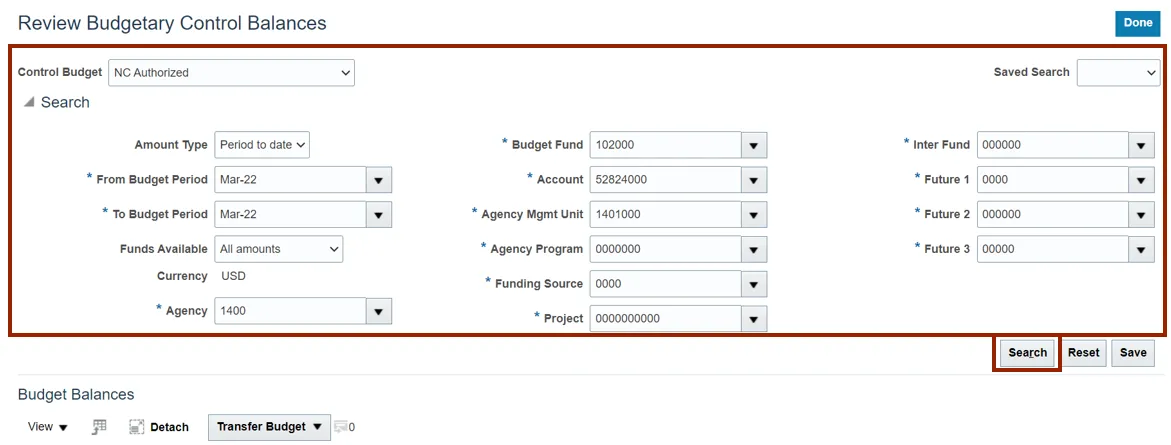 Step 4.    On the Review Budgetary Control Balances page, select the applicable choices from the respective drop-down choice lists for the mandatory fields (marked with *) and click the Search button.
