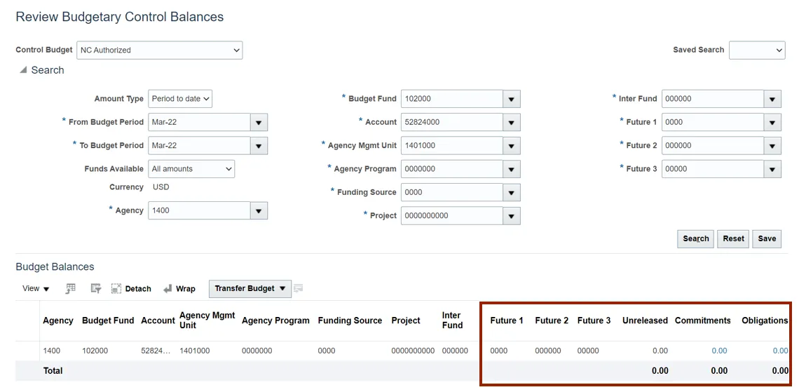 In this example, we choose NC Authorized for Control Budget, Period to date for Amount Type (You also have an option to query for Year to date), Mar-22 for From Budget Period and To Budget Period, 1400 for Agency, 102000 for Budget Fund, 52824000 for Account, 1401000 for Agency Management Unit