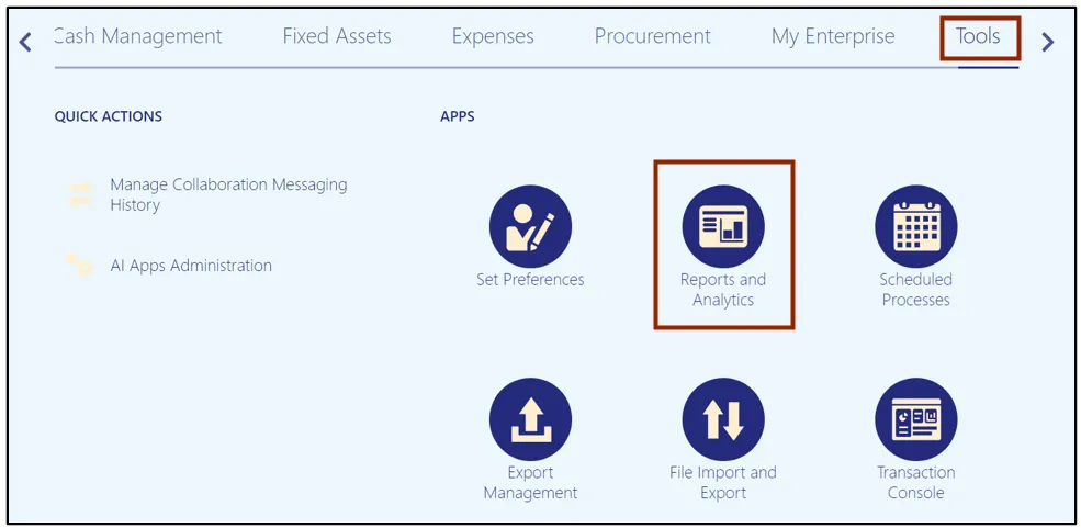 Step 1.    On the NCFS Home page, click the Tools tab and then click the Report and Analytics app.