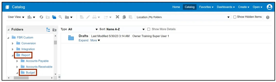 Step 4.    Under the FBR Custom folder, click the Report folder and then click the Budget folder.