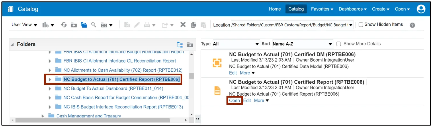 Step 5.    Click the NC Budget to Actual (701) Certified Report (RPTBE006) folder and then click the Open link under the NC Budget to Actual (701) Certified Report (RPTBE006) section.