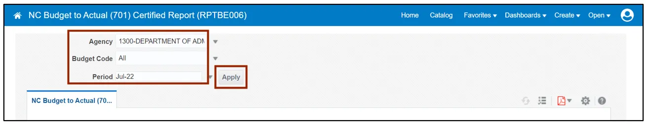In this example, we choose 1300-DEPARTMENT OF ADMINISTRATION for the Agency field, All for Budget Code field, and Jul-22 for Period field.