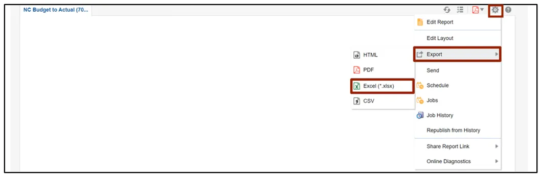 Step 8.    To export the report in desired format, click the Action icon and select the Export option from the drop-down choice list. Then click the Excel (*.xlsx) option to download the report in excel format.