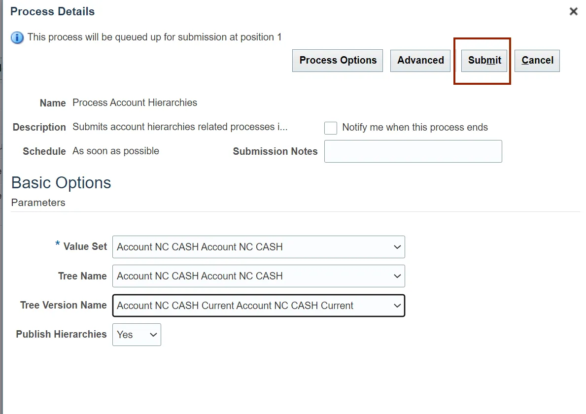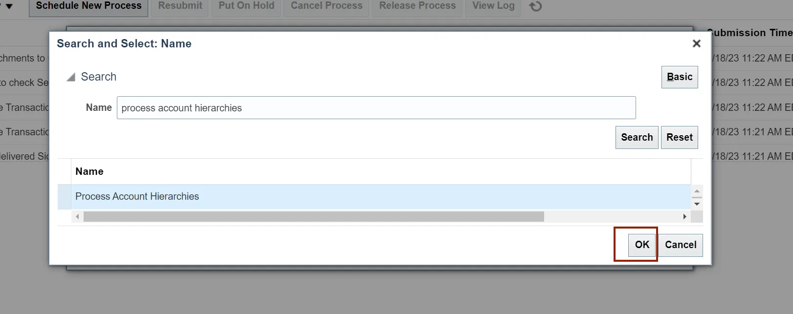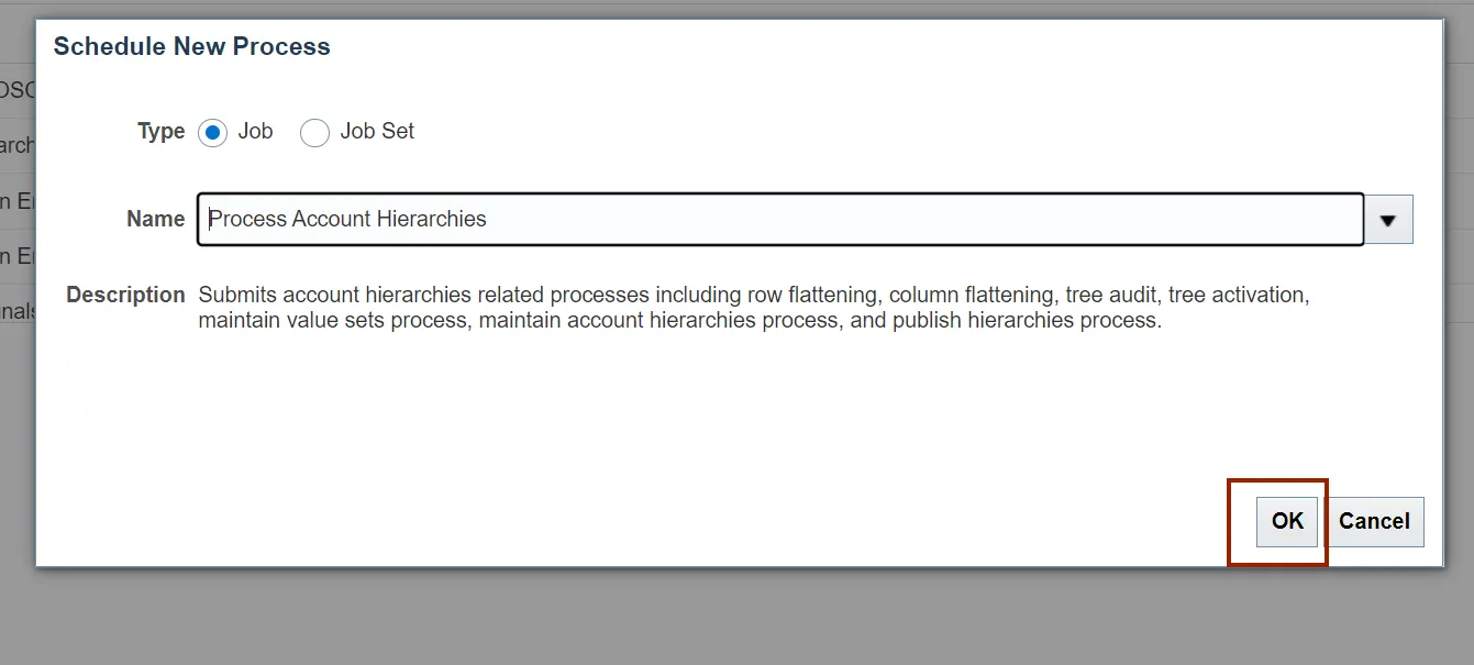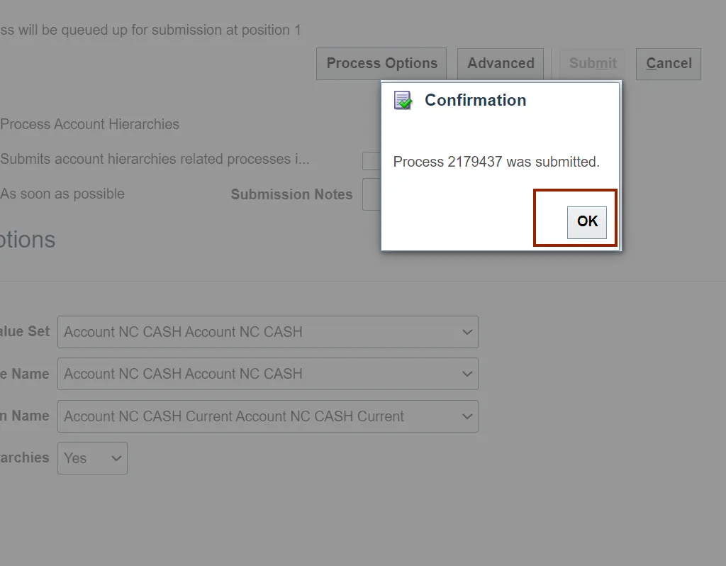 Step 10. The Process Account Hierarchies is updated in the Name field, Click the OK button.