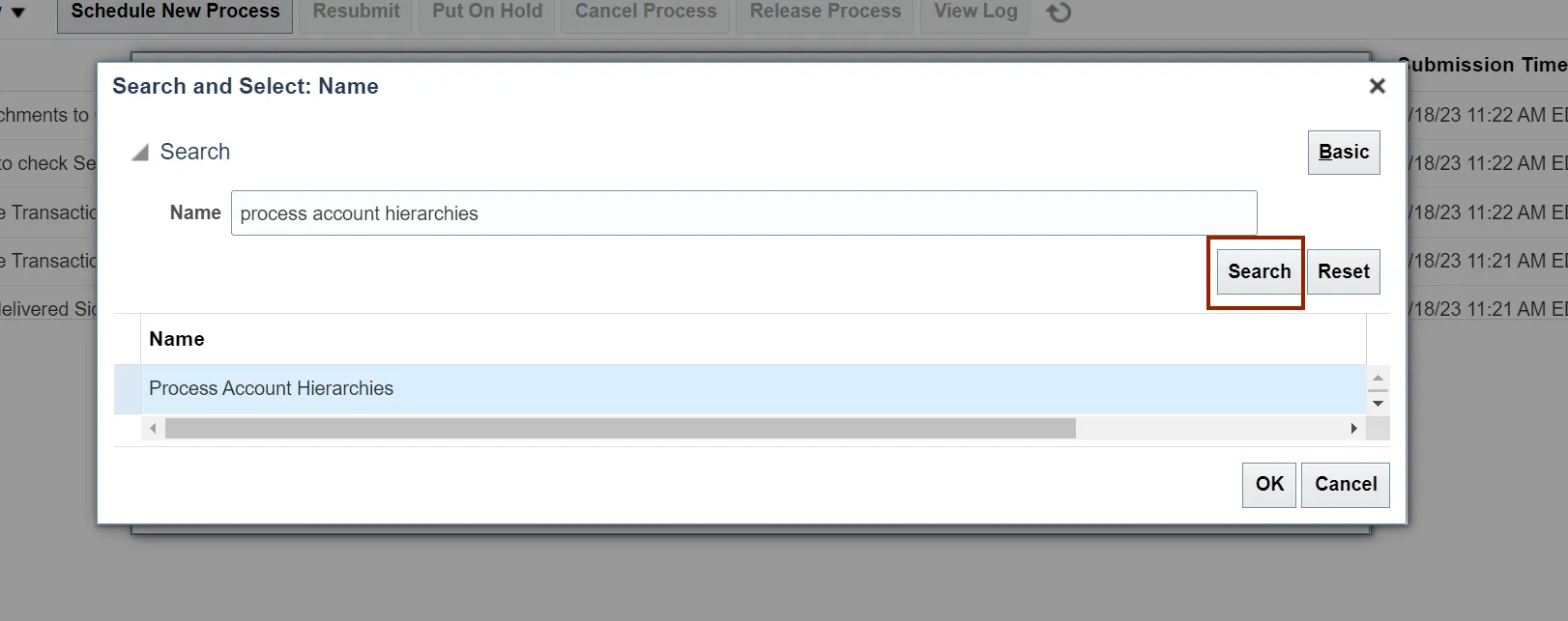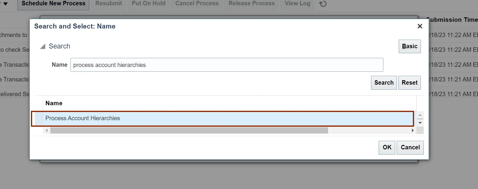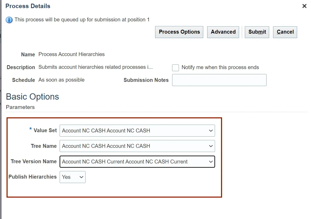 Step 10. The Process Account Hierarchies is updated in the Name field, Click the OK button.