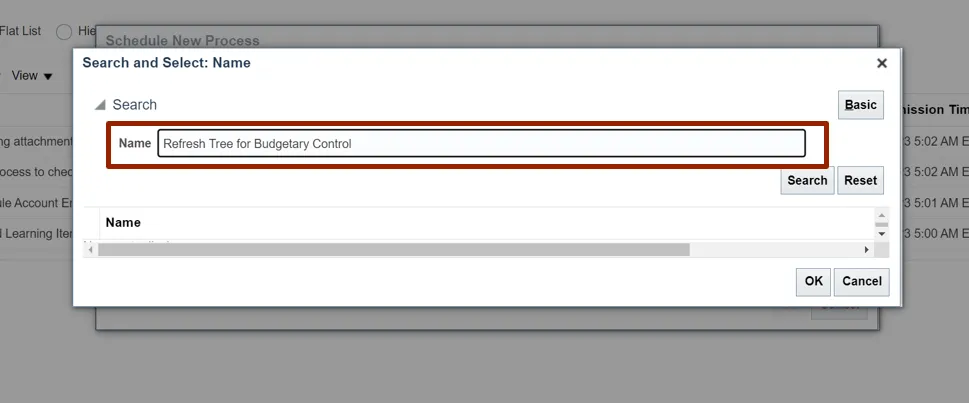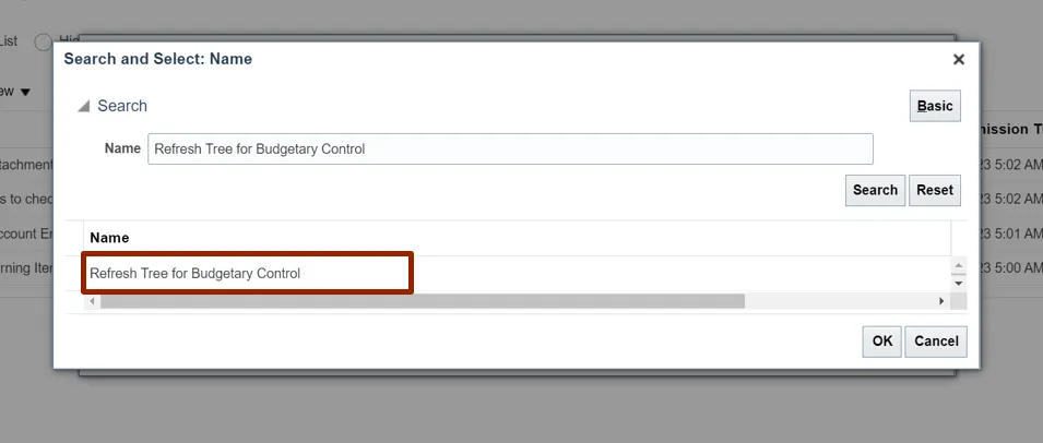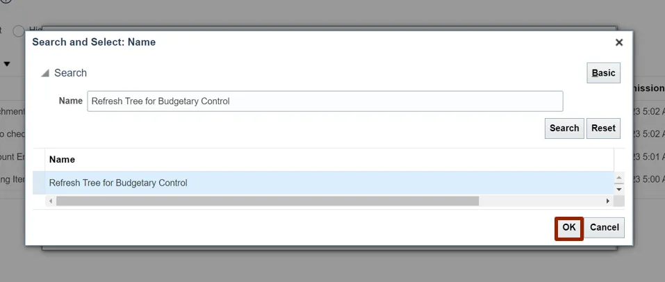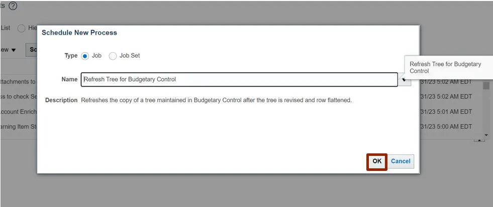 Step 10. The Refresh Tree for Budgetary Control is updated in the Name field, Click the OK button.