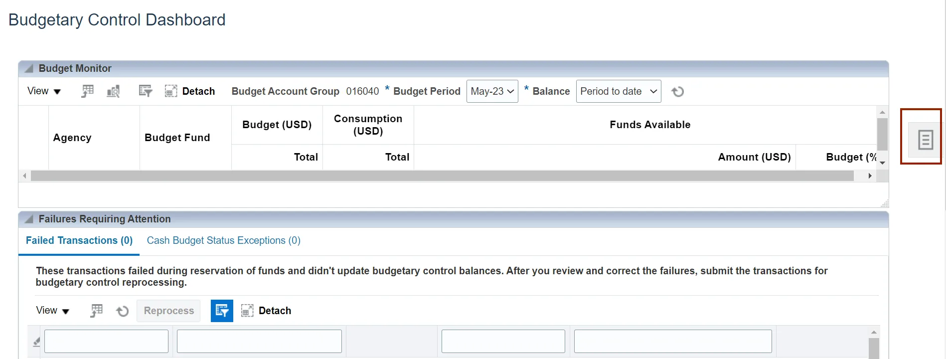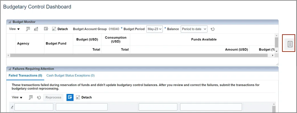 Step 3. From the Budgetary Control Dashboard page, click the Tasks icon.