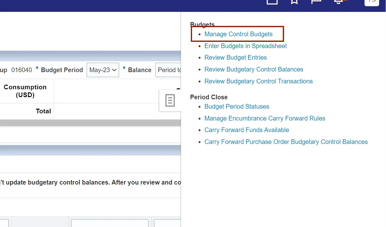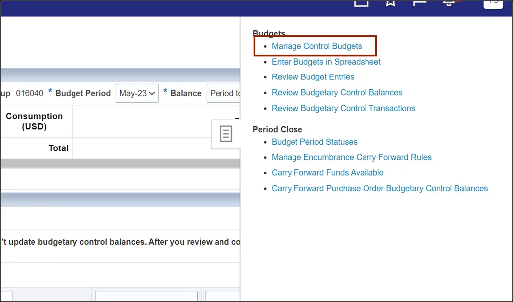 This QRG covers the explanation on how to manage control budgets in NCFS which enables the user to close control budget for use, process accounting hierarchies for budgetary control, run refresh control budgets scheduled process, and prepare control budget for use.
