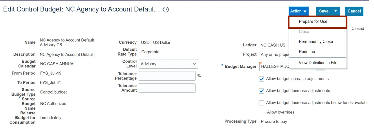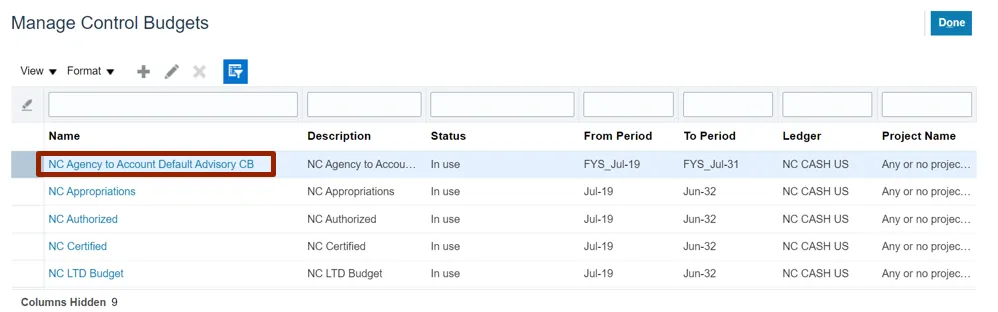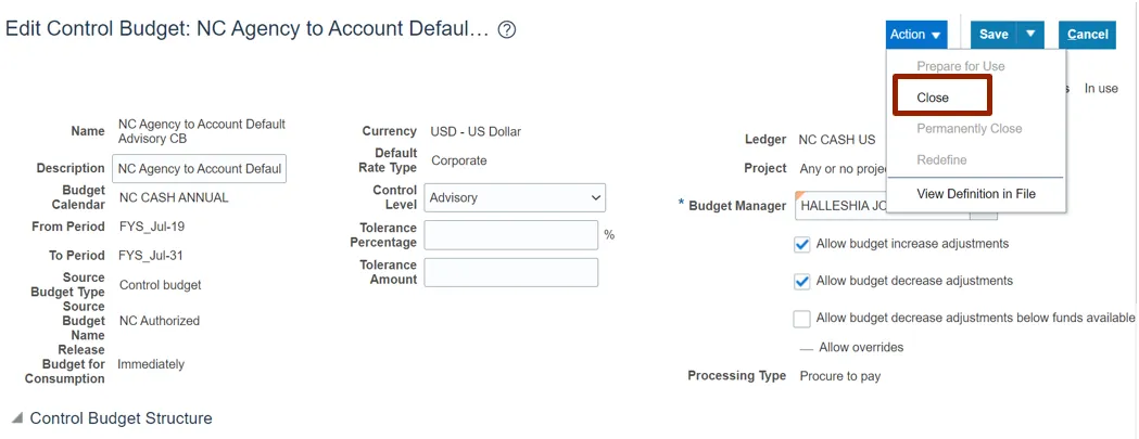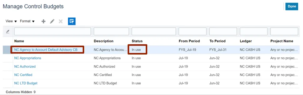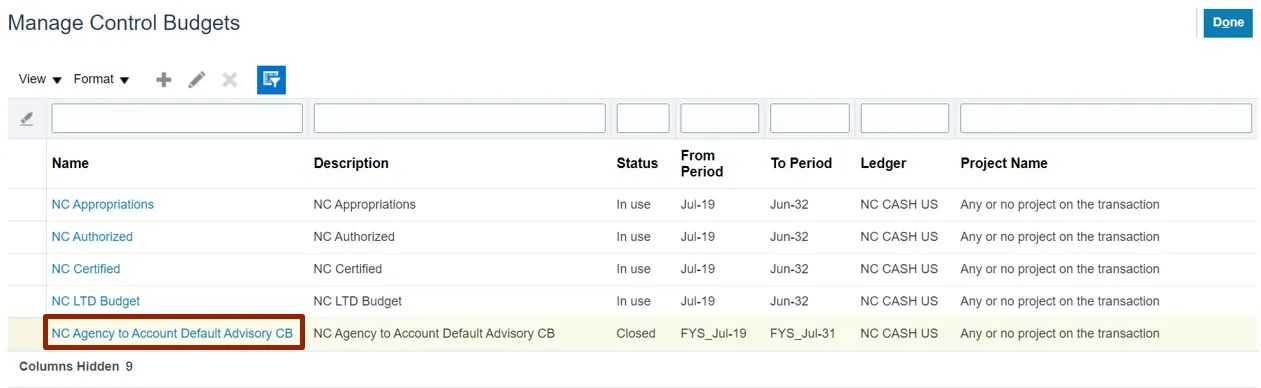 Step 5. From the Manage Control Budgets page, select NC Agency to Account Default Advisory CB control budget with status Closed.