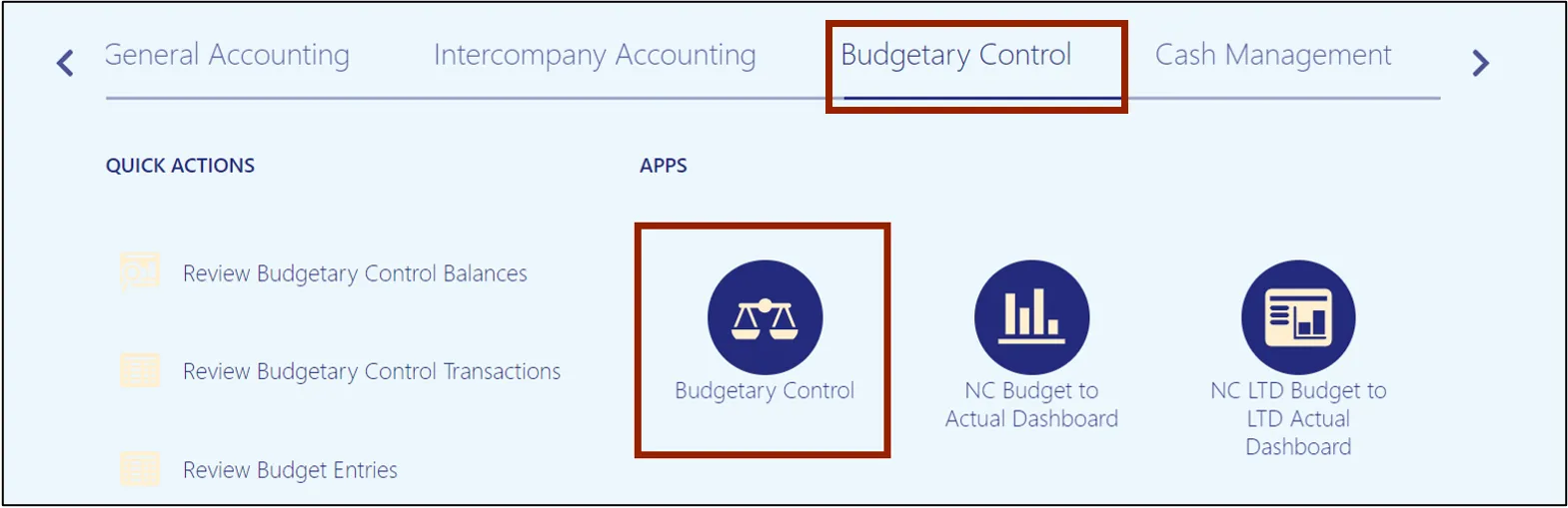 Step 2.    On the Home page, click the Budgetary Control tab and click the Budgetary Control app.