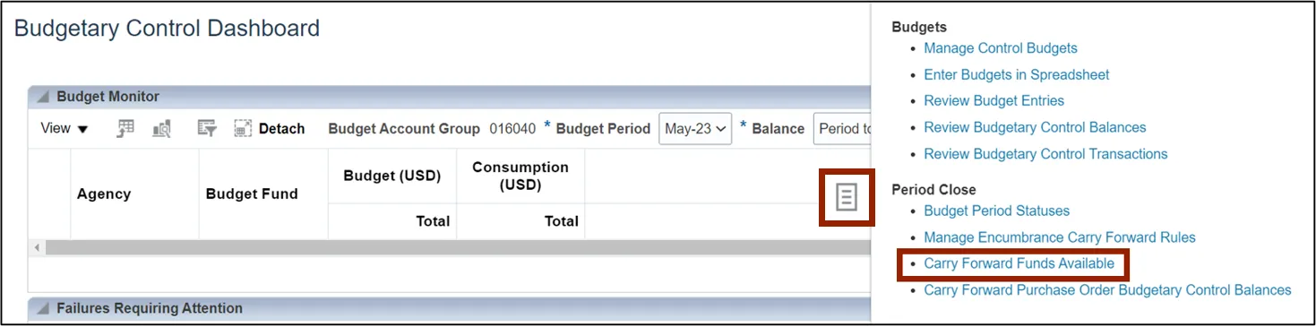 Step 3.    Click the Tasks icon and under Period Close, select Carry Forward Funds Available.
