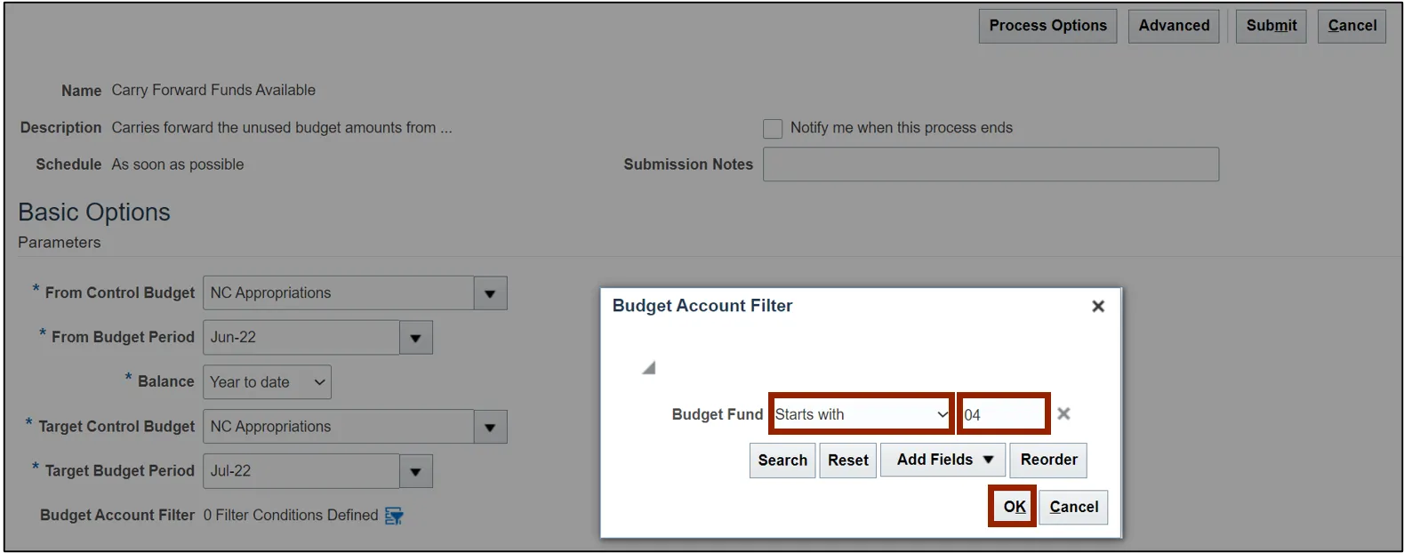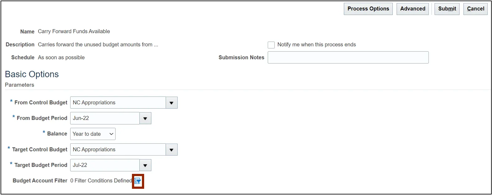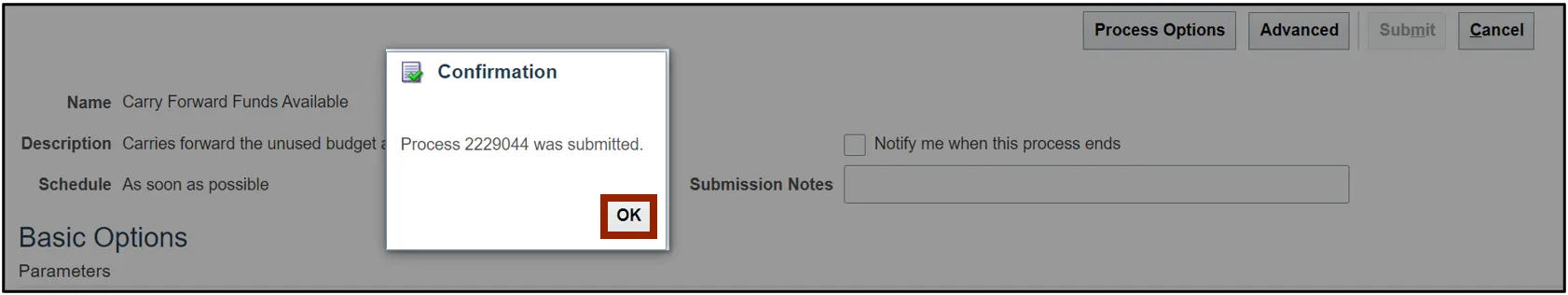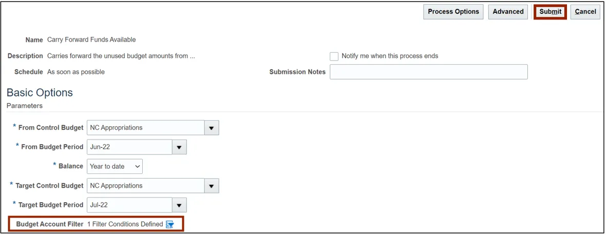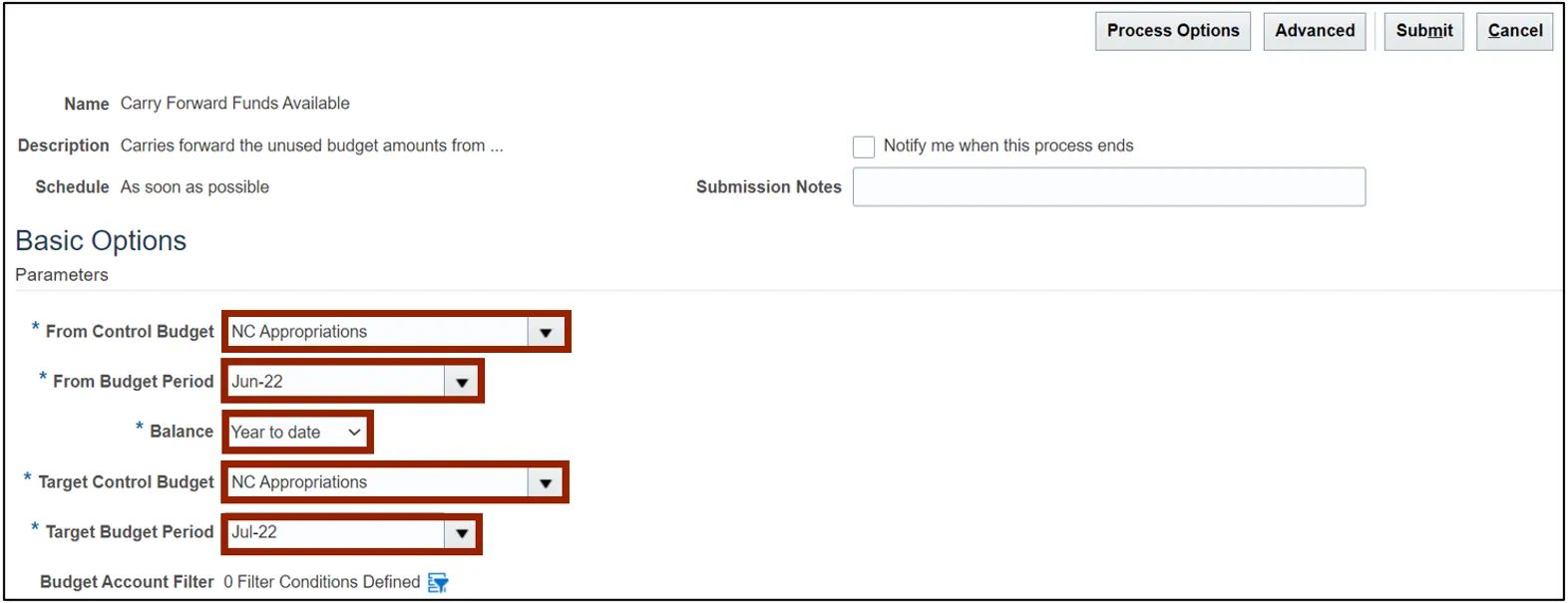 Note: You can view the review budgetary control balances screen to verify the carryforward amounts.