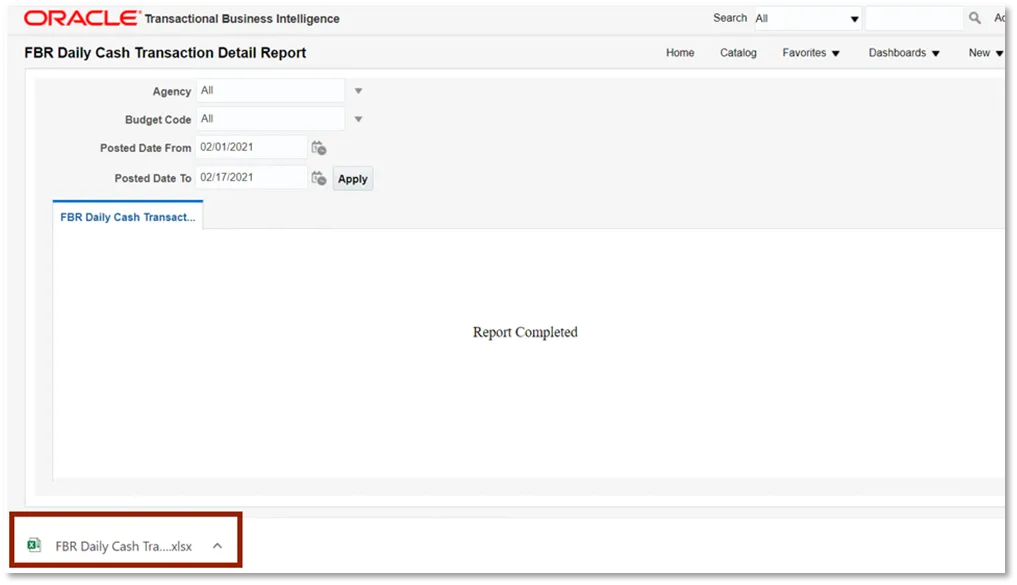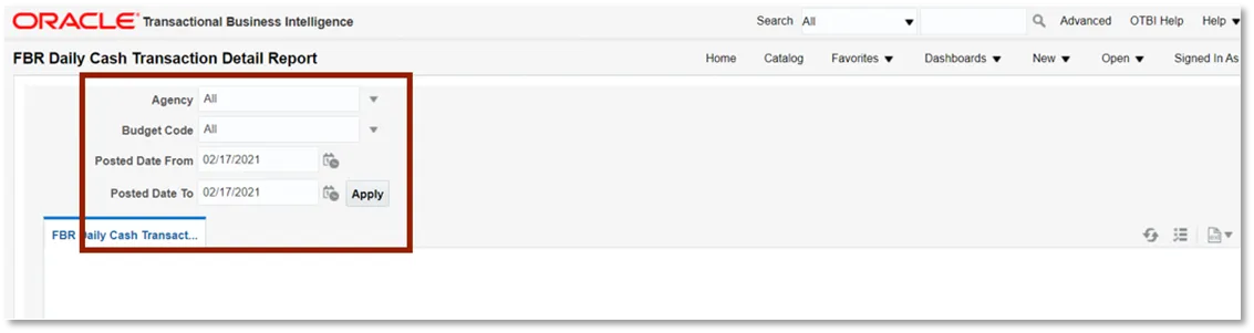 Step 4. Select the desired Agency, Budget Code Type, Posted Date From, and Posted Date To. Then click Apply.