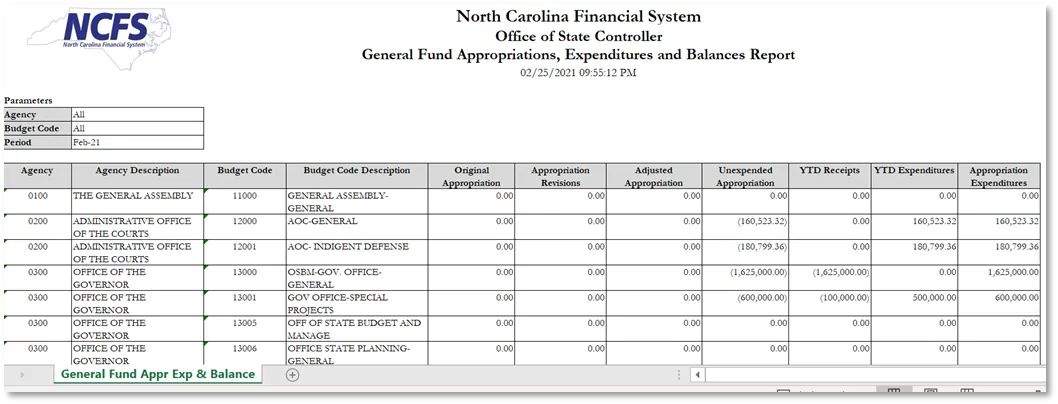 This Quick Reference Guide covers the navigation to the General Fund Appropriations, Expenditures, and Balances Report and how to generate the report output. The General Fund Appropriations, Expenditures, and Balances Report provides North Carolina Financial System users with YTD balance information (deposits/allotments, disbursements, and transfers) in “Posted” status in the NCFS and related budgetary activity in the Budgetary Control module. The General Fund Appropriations, Expenditures, and Balances Report provides budgetary and financial data for reverting general fund budget codes.