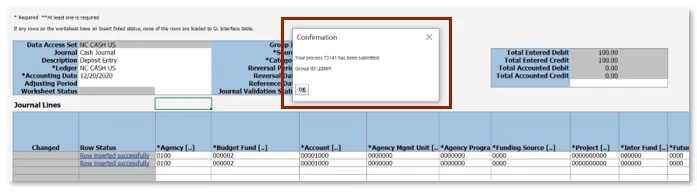Once the journal has been submitted it must be approved before it is eligible for posting. Users can search for the uploaded journal by querying the Journal Name from the Manage Journals screen. If the entry is rejected, the users will receive a rejection notification that includes the reason for the rejection. If the Journal is rejected, the user can edit, complete, and request approval for the journal or delete the journal. Users can confirm the spreadsheet upload in the manage journals screen in the General Accounting Module.