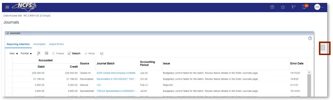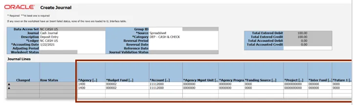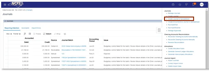 | Spreadsheet Upload | Journals can be entered via Spreadsheet Upload. Users can enter a single or multiple transaction into NCFS. |