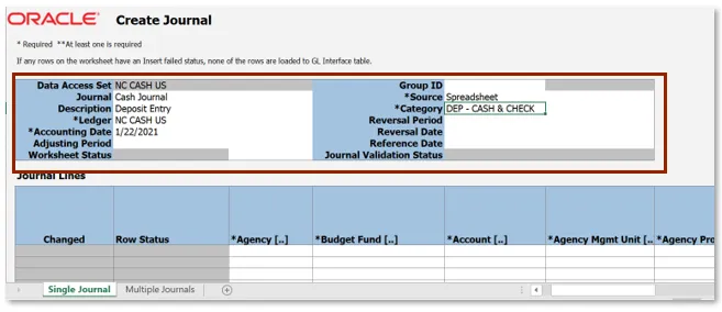 This QRG provides step-by-step instructions on how General Ledger (GL) Journal Entry users enter journal entries via NCFS Spreadsheet Upload functionality. A journal entry is the record of a financial transaction recorded (entered) into a journal. NCFS provides the capability for users to prepare journals via spreadsheet (outside the system) for later upload to the system. Prior to being able to access the North Carolina Financial System (NCFS) spreadsheet, the Application Development Framework Desktop Integration (ADFDI) plug-in must first be installed. Please reference our “Installing Application (ADFDI)” QRG for more information on how to download and install ADFDI plug-in on the device. The NCFS spreadsheet allows users to enter a single journal or multiple journals at a time. This spreadsheet must be downloaded initially from NCFS and will require the user to log in to allow the template to prepopulate. However, once this template is saved to the user's computer, it can be accessed and completed via Microsoft Excel. Once complete, the user must log in to NCFS from the spreadsheet to upload the journal to the system. Entering journals via Spreadsheet Upload is broken down into three distinct sections: accessing, entering, and uploading journal entries.