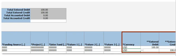 Step 3. Click the Currency drop-down arrow the select USD. Enter the amount in either the Entered Debit or Entered Credit column as applicable for each line.