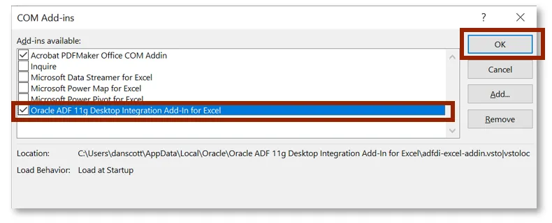 Step 10.    Select the Oracle ADF 11g Desktop Integration for Excel check box, then click OK.