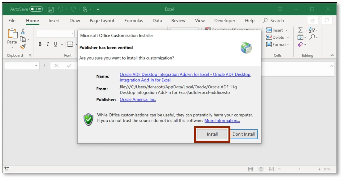 Step 5.    After successful download, open Microsoft Excel to complete the additional setup steps. A popup appears verifying that Add-in installation. Click the Install option.