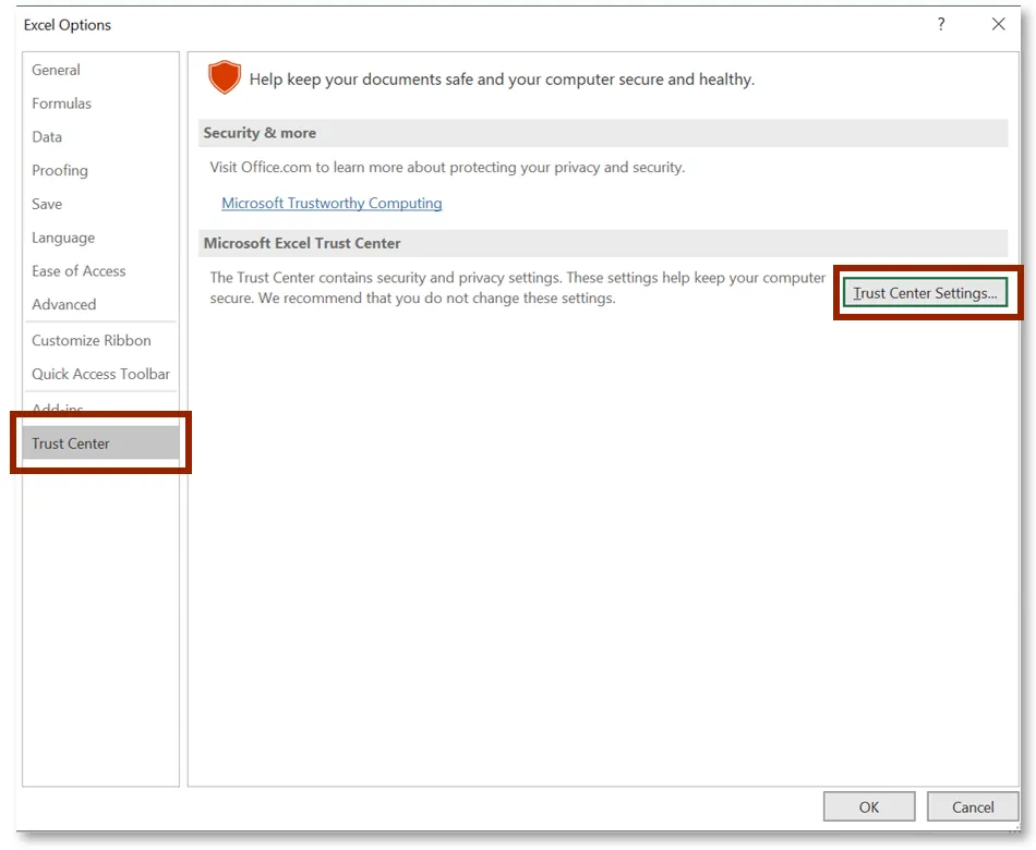 Step 6.    Click Trust Center and then click Trust Center Settings.