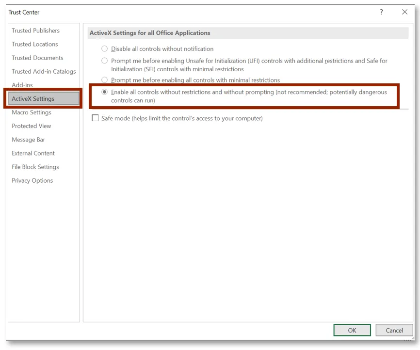 Step 7. Click the ActiveX Settings option. Select the Enable all controls without restrictions and without prompting option.