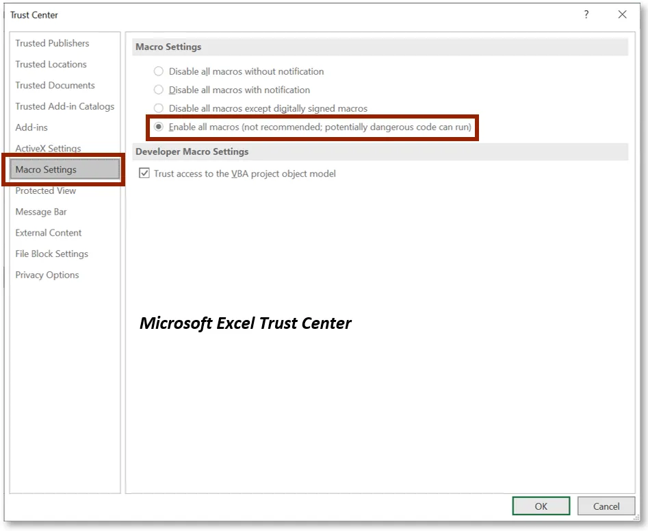 Step 8.    Select the Macro Settings option. Select the Enable all macros and the Trust access to the VBA project object model options.