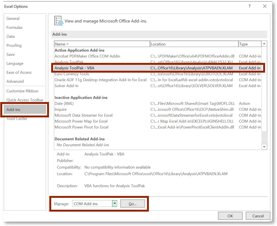 Step 9.    Navigate back to Excel Options and select the Add-Ins options. Click Analysis Toolpak – VBA and COM Add-Ins at the bottom of the page, then select Go.