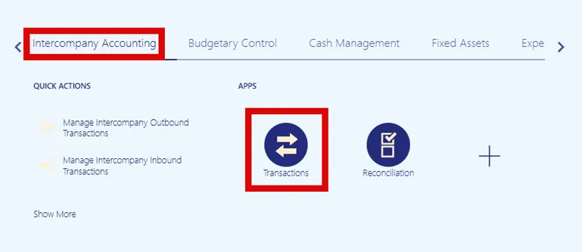 Step 2.    On the Home page, select the Intercompany Accounting tab. Then select the Transactions app.