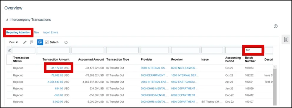 Step 2.    On the Intercompany Transactions Overview page, under the Requiring Attention tab, identify the rejected Batch Number. After typing in the batch number, hit the Enter key on your keyboard. This will isolate all other results only showing the desired transaction. Now open the transfer transaction by clicking the Transaction Amount link.
